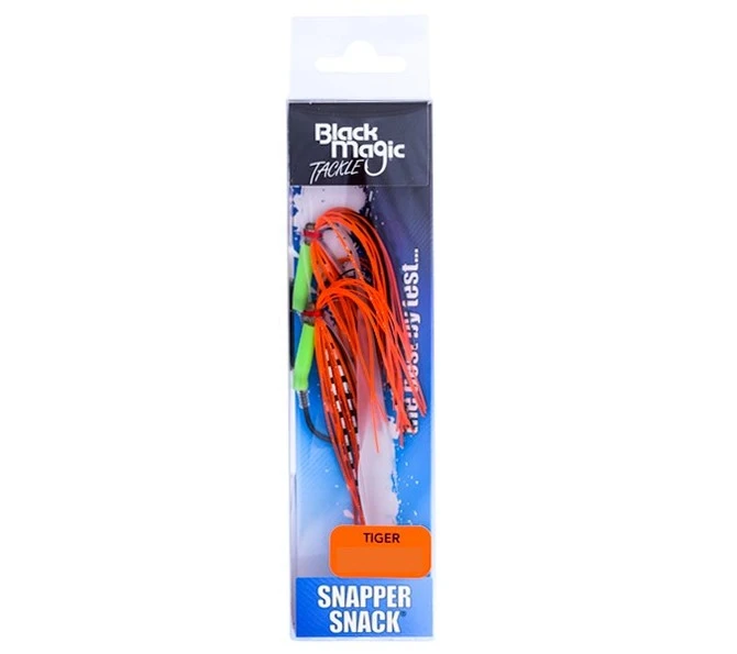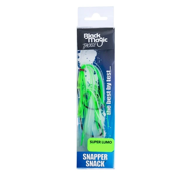 Trigger the predatory instinct of your target species when you bait up and drop down a Black Magic Snapper Snack. This two hook ledger-style rig is the most efficient combination of a rig and a slow jig lure. The high UV rubber skirts and luminous tubing ensure maximum attraction while the self-hooking non-offset KLT hooks will seal the deal. Combine with a thin strip of bait to make it absolutely lethal. (Sinkers not included).