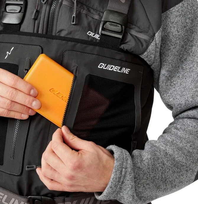 Manufactured from a strong, 4-layer Nylon fabric with a 20 000mm water resistant and 5000g/m2/24hrs moisture transporting membrane. An environmentally friendly PFOA free DWR surface treatment repels both dirt and water from the outshell. Inseams on the waders are eliminated by our Sidewinderâ„¢ design, which also gives good articulation and a comfortable fit. Positioned high on the chest, are two large, chest pockets with vertical zippers and mesh fronts. Behind you find fleece lined roomy hand warmer pockets for those chille days.