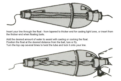 The A-Just-A-Bubble by Rainbow Plastics is an adjustable float that can be used as a stationary float or a slip float to fish at the desired depth. Rig with the wider end of the float toward the rod tip when suspending baits or rig with the narrower end of the float toward the rod tip when retrieving lures and flies. Simply feed your line through the float, slide it into position and turn the top cap to twist the internal surgical rubber, locking the float onto the line. This allows the float position to be adjusted in seconds, without the use of pegging or stoppers that can be time-consuming and damage the line. Simply open the top cap to add water to cock the float increase casting distance or cast light flies or lures with a spin rod.