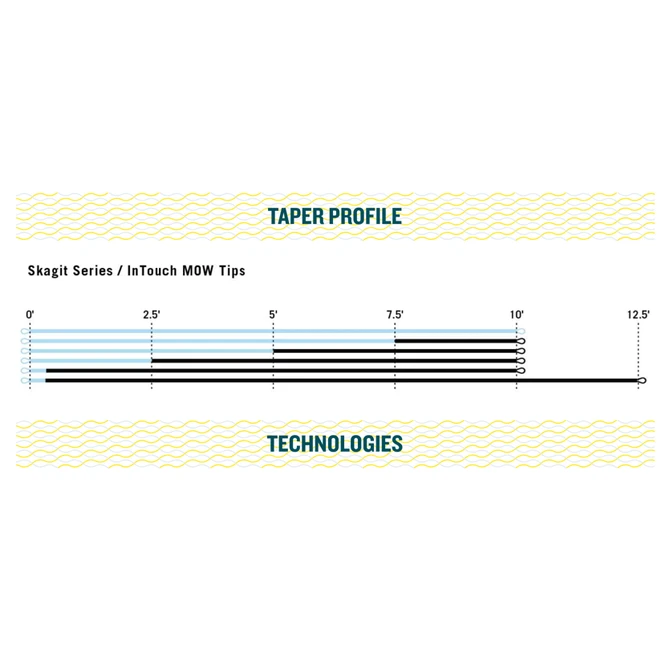 The Light MOW Tips feature T-8, with a sink rate of 7″ per second, for the sinking material. Each of these tips has either a white floating section, and a black sinking tip or if full sinking, a dark red colour, for easy identification. The Light MOW Tips are designed for lightly weighted flies and are ideal for Skagit lines of 475 grains and less. There are six unique tips that make up the series.